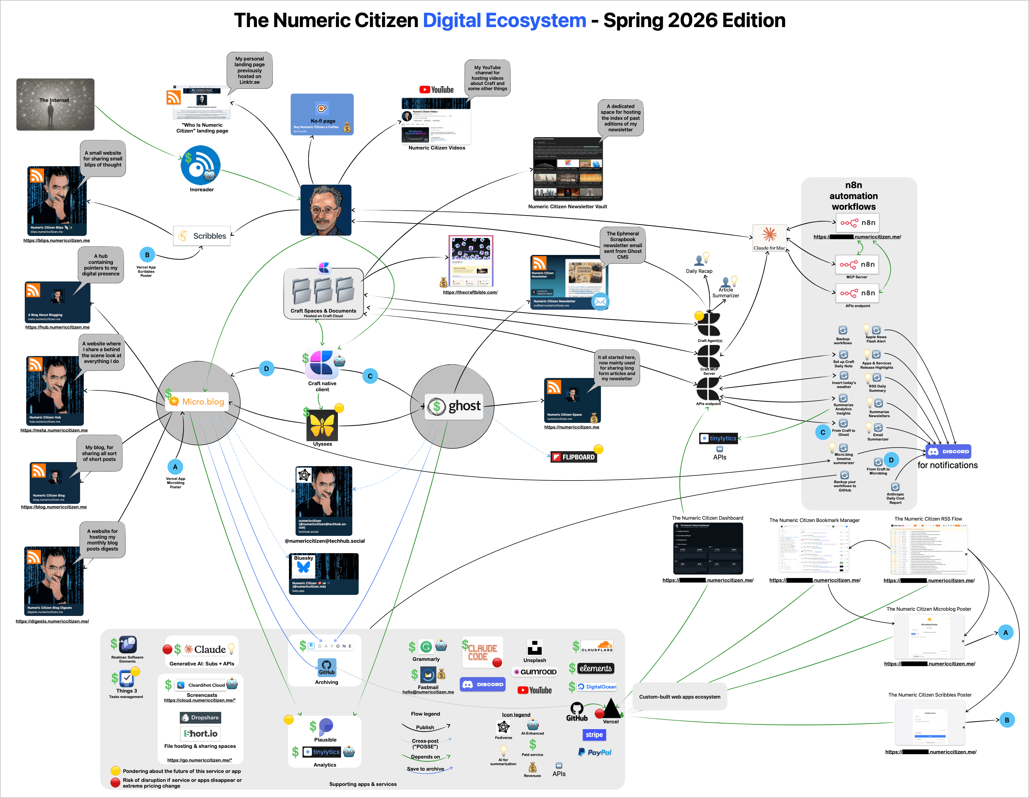 At a high level, both Micro.blog and Ghost remain the two hosting and publishing pillars for most of my *.numericcitizen.me websites, while a few other websites, like my Ko-fi page and my new about website, Who Is Numeric Citizen, are hosted elsewhere. On the diagram, my websites are positioned on the left and in the top-left portion.