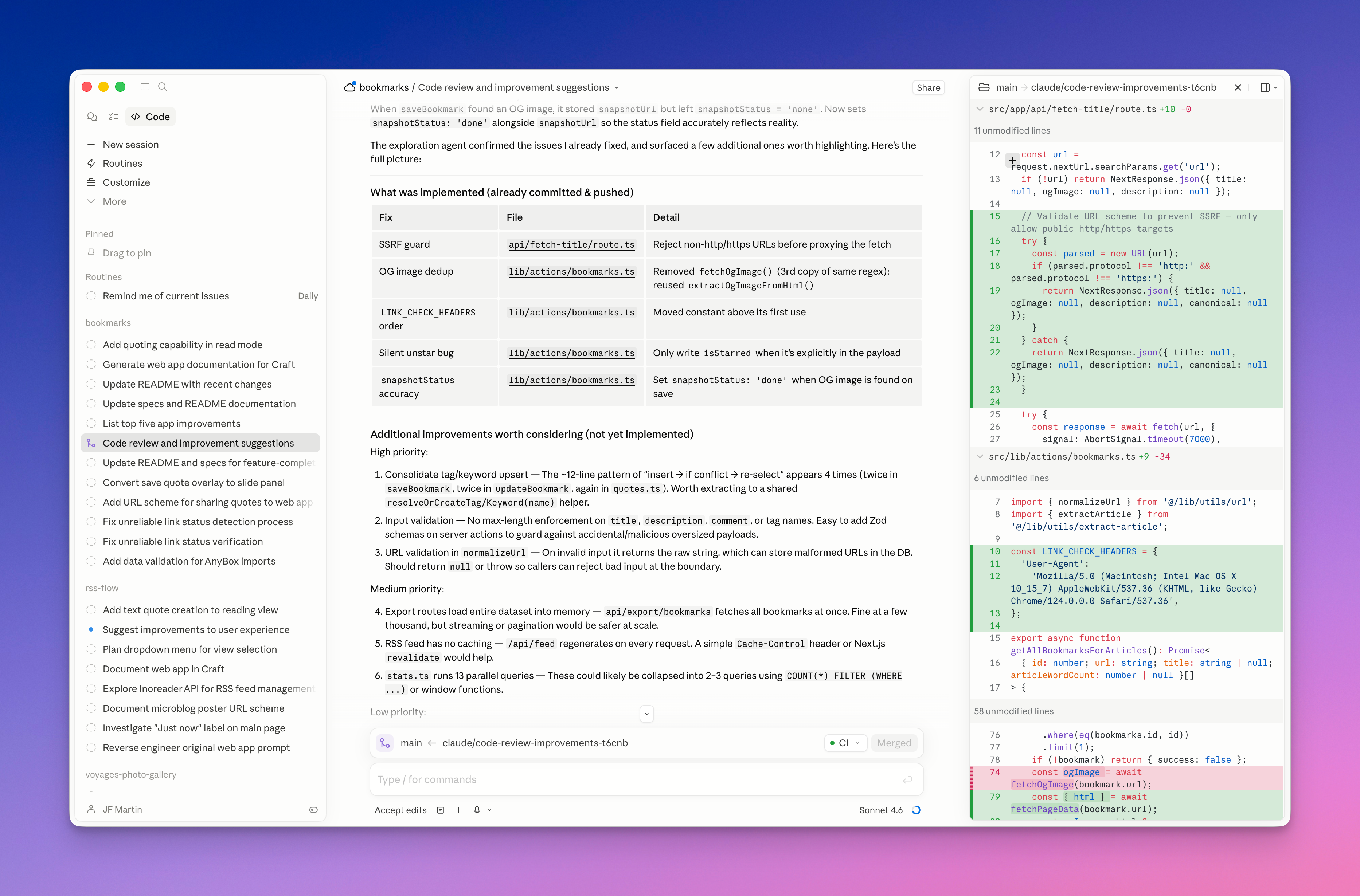 Claude Code’s main window with some of my projects on the left sidebar and the DIFF view shown on the right