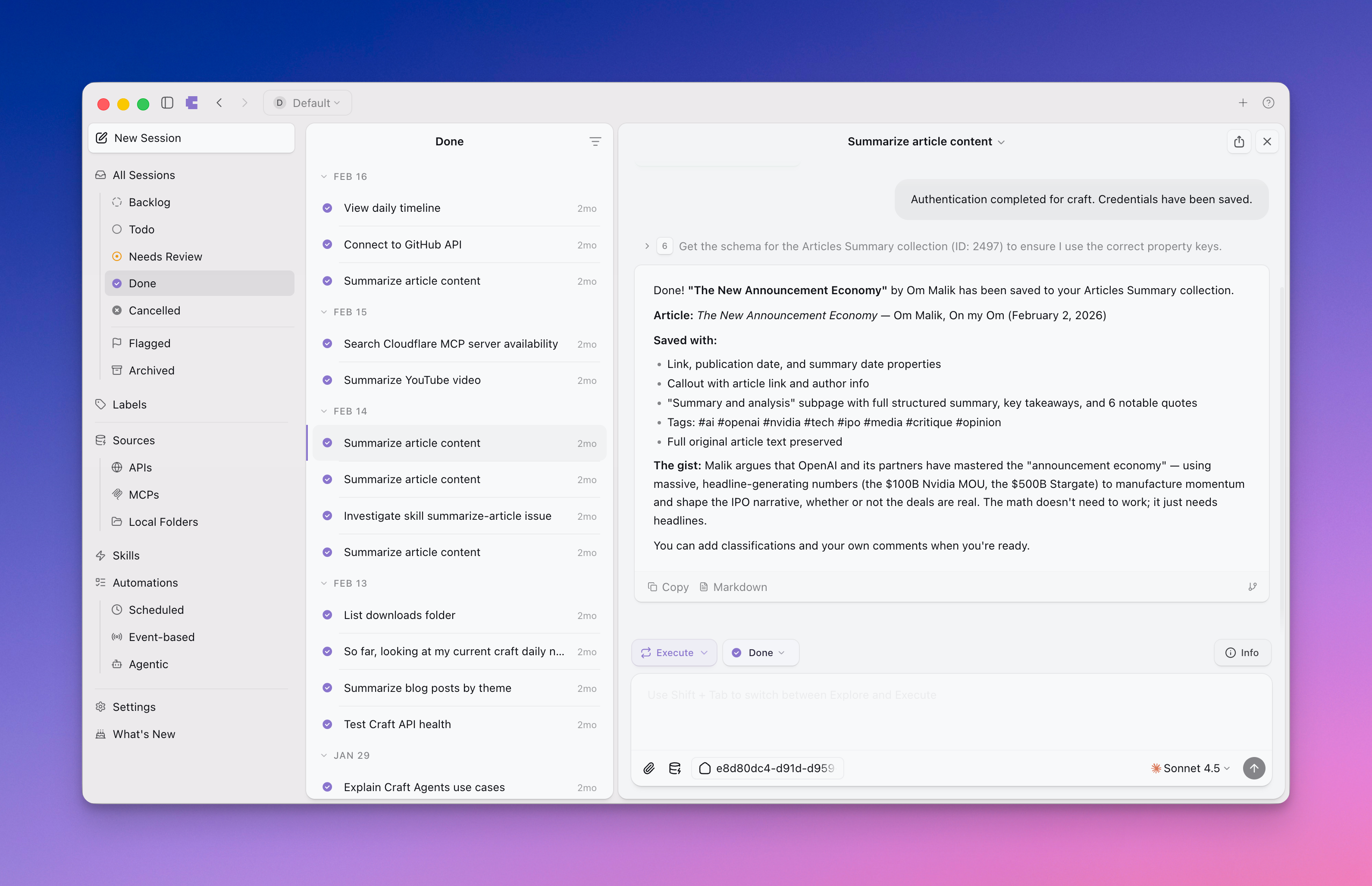 A few thoughts and observations about Craft Agents, a sort of spin-off of Craft, are worth sharing here. Think about Craft Agents as an orchestrator of AI agents. In many ways, Craft Agents can be compared to the Claude Desktop app. There is a high level of affinity between Craft Agents and Craft, connected via APIs or MCP. Consuming Craft content through Craft Agents is an obvious use case. Yet, I’m still not sure why the team behind Craft is spending so much effort on this, but it’s interesting to follow nonetheless. I’m still looking for clear use cases for it, hence the yellow dot (🟡) on its icon in the diagram. There are a few aspects of the app’s design and structure that I don’t like. I don’t like using the task manager to organize conversations. I don’t think task management belongs in this app. Plus, Craft Agents is a very hungry consumer of AI credits. It’s a major concern unless you subscribe to the highest tier of any AI provider (OpenAI, Anthropic, etc.). It’s worth noting that Craft also offers an assistant working inside Craft itself.