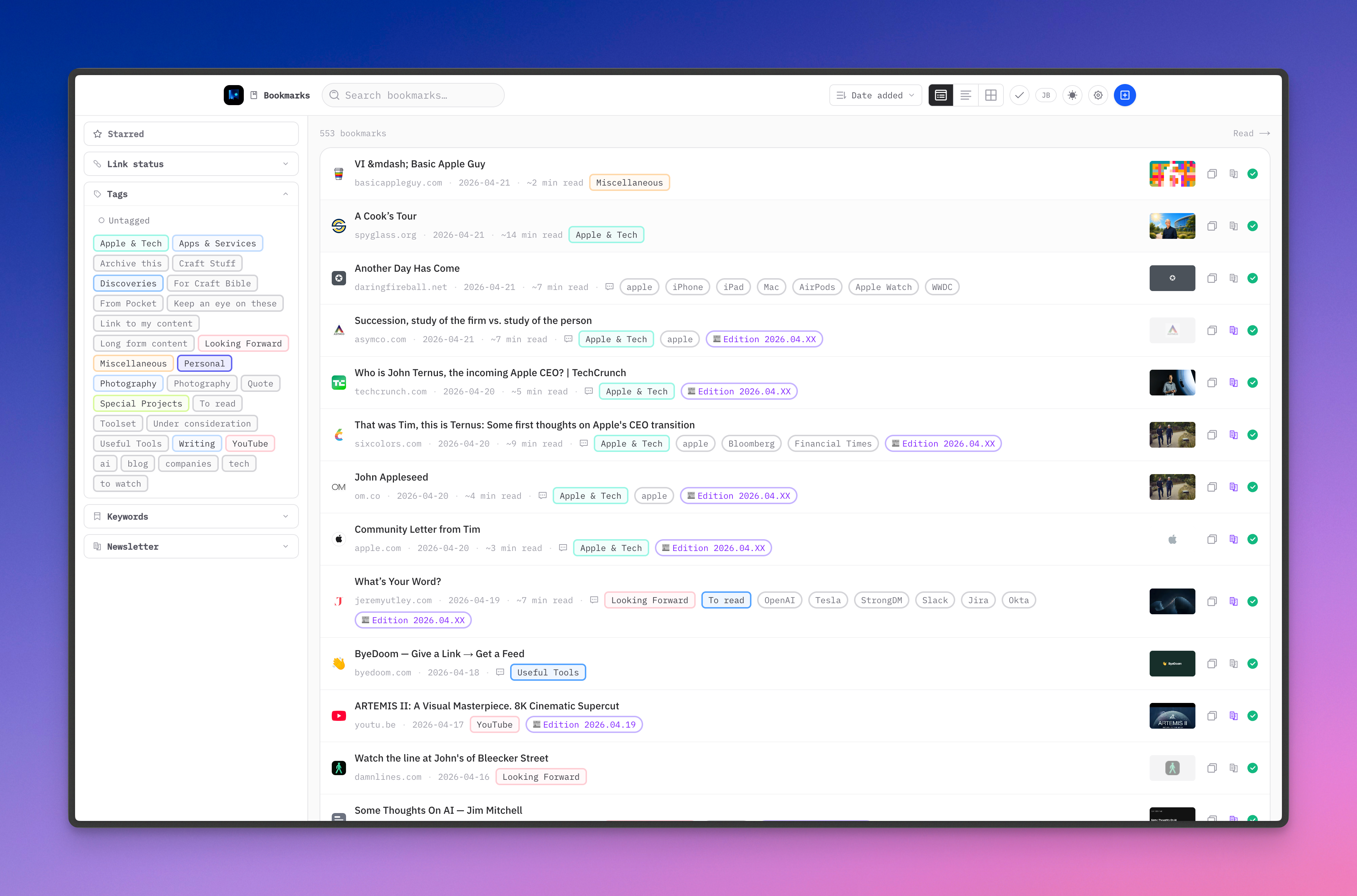 Gone is Google News for cross-posting from Micro.blog. It never took off. Also gone is AnyBox, the very well-done bookmark manager available on all Apple platforms, but not available on the web, like Raindrop.io. I never liked Raindrop.io, so I built my own bookmark manager as a web-only app. It’s one of my new custom-built web apps.